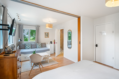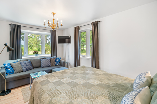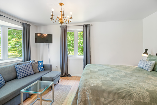 Spacious ensuite with magnificent views of the vineyards of the nearby Two Sisters vinery. Room has a divider so it can be divided into two rooms, sofa with pull-out sofa bed . Modern bathroom with His and Her vanity, walk in shower. (Bathroom has Walk-In Shower)