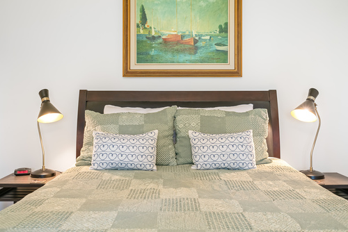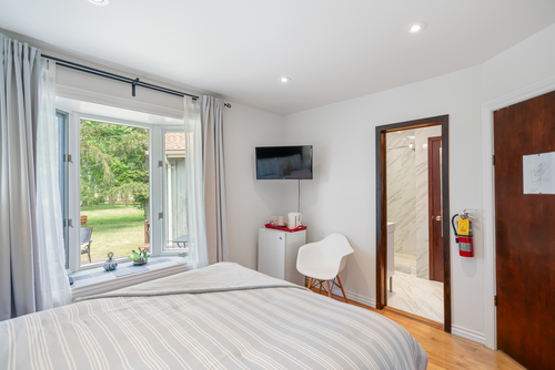Queen... Queen suite has equipped kitchen, fridge, microwave, toaster, kettle, cutlery and dishes. Bedroom has a large windows with the view of the mature forest trees and beautiful vineyards of the nearby Two Sisters vinery. Queen suite is tastefully decorated with the original artwork of the Italian and Dutch masters. It is equipped with in-suite climate control for the air conditioning and heating. Complimentary bottled water and tea. Bathroom at the Queen Junior Suite has a walk in shower, floor to ceiling marble walls and marble floor, sink vanity, hairdryer, complimentary toiletries including shampoo.